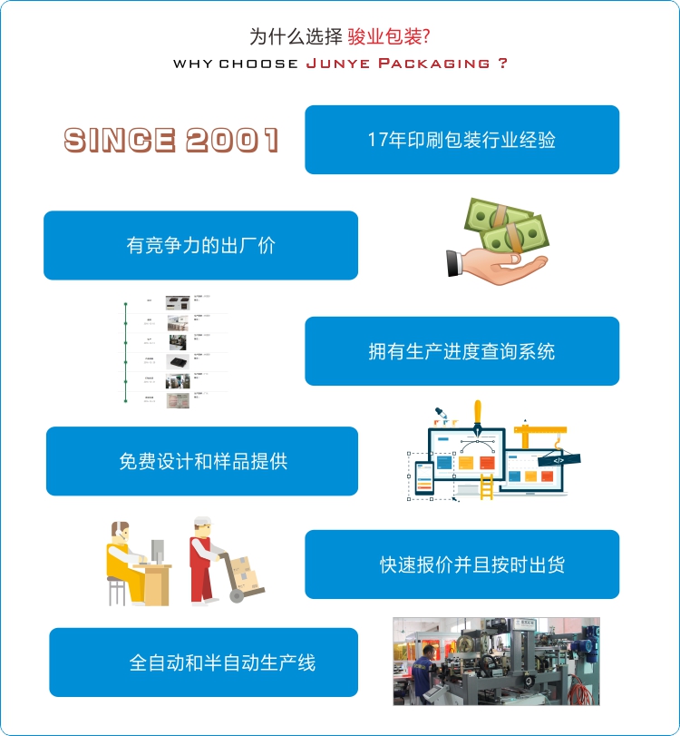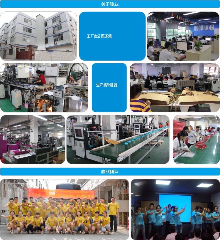 廣州駿業包裝實業有限公司創建于 2001,是一家以印刷包裝制品為主營業務的集設計、生產、銷售為一體的一般納稅企業,主要生產各種精品包裝盒、紙袋、吊牌,其主要應用于服飾、皮具、化妝品、保健品、禮品、首飾、茶葉、酒類、電子產品及其它日用制品等行業,并通過了德國萊茵認證、BV認證、SGS認證和WCA認證.
